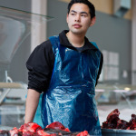 Hylkeenlihaa, valaanpaloja ja pullosilmäisiä puna-ahvenia. 19-vuotias Aabus Markussen myy rivakasti Nuukin liha- ja kalatorin kylmäaltaiden antia. Kolmen vuoden kokemuksella hän on jo tottunut myyjä.
